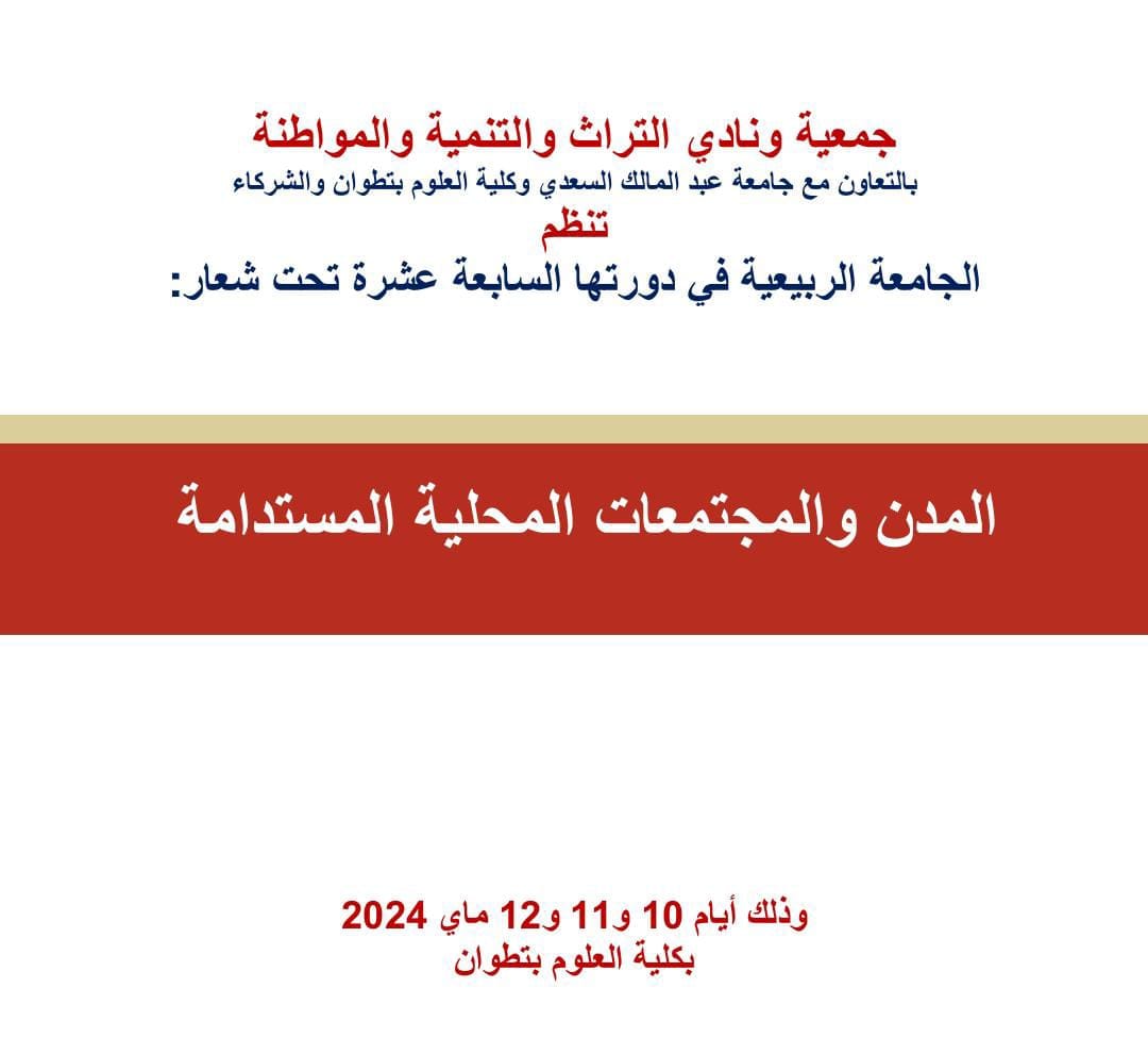 L'Association Patrimoine, Développement et Citoyenneté en Collaboration avec l'Université Abdelmalek Essaadi et la Faculté des sciences, organise la 17 ème édition de l'Université de Printemps sous le thème : villes et communautés durables.