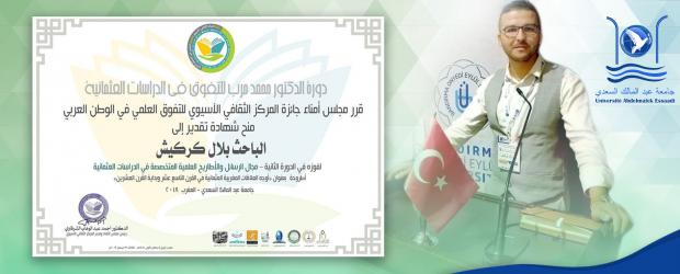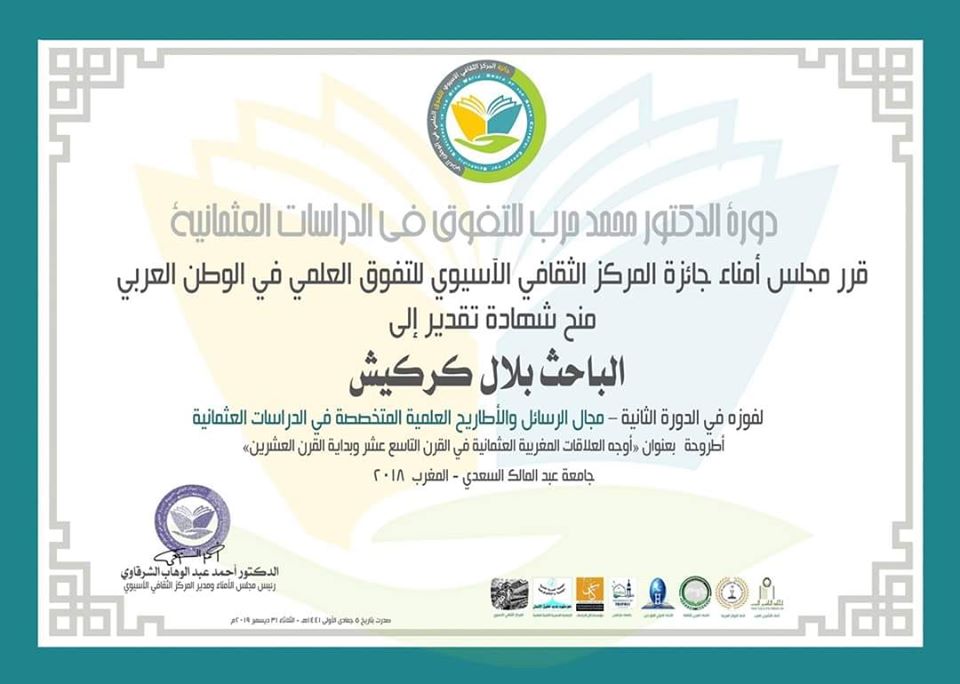 فاز الطالب الباحث بلال كركيش المسجل بمركز الدكتوراه في الآداب والعلوم الإنسانية والترجمة بكلية آداب تطوان، جامعة عبد المالك السعدي، (تكوين شمال المغرب وعلاقته بحضارات حوض المتوسط) في موضوع : "العلاقات المغربية العثمانية-التركية خلال القرن التاسع عشر ومطلع القرن العشرين" تحت إشراف الدكتور مصطفى الغاشي، بجائزة المركز الثقافى الآسيوي للتفوق العلمي في الوطن العربي، صنف الرسائل والاطاريح العلمية المتخصصة في الدراسات العثمانية. وبهذه المناسبة نهنئ الطالب الباحث بلال كركيش على هذا الإنجاز ونتمنى له التوفيق في مساره العلمي داخل المغرب وخارجه.